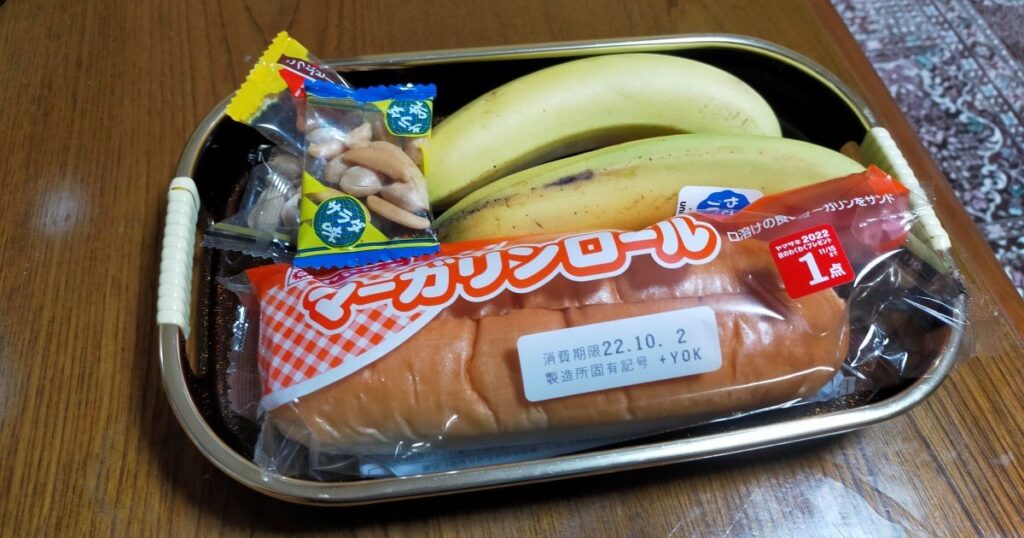 朝食は、宿の女将さんからお接待でいただいたマーガリンロールとバナナ。