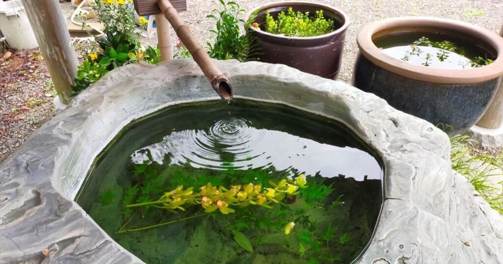 手水舎には草花が浮かべられていて、見ているだけで涼やかな気持ちになる。