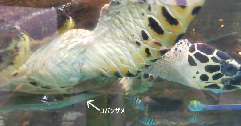 コバンザメが亀のお腹に張り付いている姿が、どこかのんびりしていて面白い。